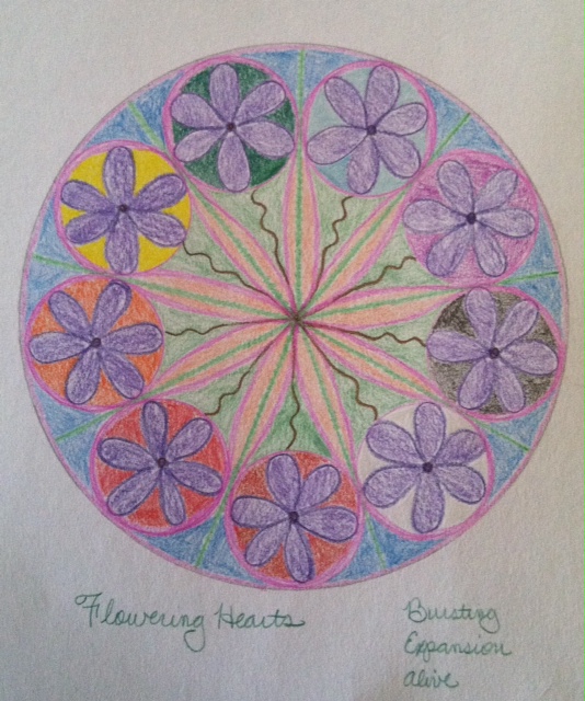The discussion at last night’s gathering reminded me of how I would turn to art when I was a child to deal with the stress and frustrations at home, and of how easy it was and is for me to empty my mind, become mind-less, while drawing and doing creative projects. I had no plan as I started, but used the suggested Valentine’s Day theme to start me off. Then I just let the pencils flow as they wished. Without the heavy burdens of the mind, I felt like I could fly like a butterfly. At the end, we were asked to write down a title and any words that came regarding our mandalas (see left). I noticed that when I am in a patient, present/mindful, yet mind-less state, I am most expansive.