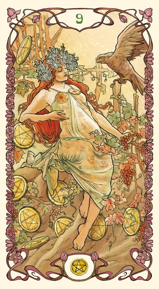mucha2I have written about the symbolism of the falcon before inΒ Animal Spirits: The Hawk and theΒ Falcon, but this encounter had a much more personal message, which is interwoven with the symbolism of the Nine of Pentacles. This card is about financial gain, but it is also about independence – being free to do what one loves and enjoys. In the readings in the videos below, for the ones in which this card came up, there was also a message of being free and secure to move on or forward and to take flight. Both the falcons and the Nine of Pentacles have been sending me messages of affirmation for where I am in life right now: feeling free to express myself, independent, yet building my network and community, and picking up momentum to take off in flight.