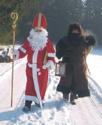 There is Belsnickel, a ragged-looking Nicholas (-nickel) who goes to homes to pelt (Bels-) or beat naughty children into being good. And there is Krampus, a demon-looking creature, who may also beat children with a branch, or he may take evil children to eat or kill. On a slightly lighter note, there is also Santa’s servant Zwarte Piet (Black Pete), who might leave naughty children coal or a bunch of twigs instead of gifts and sweets.